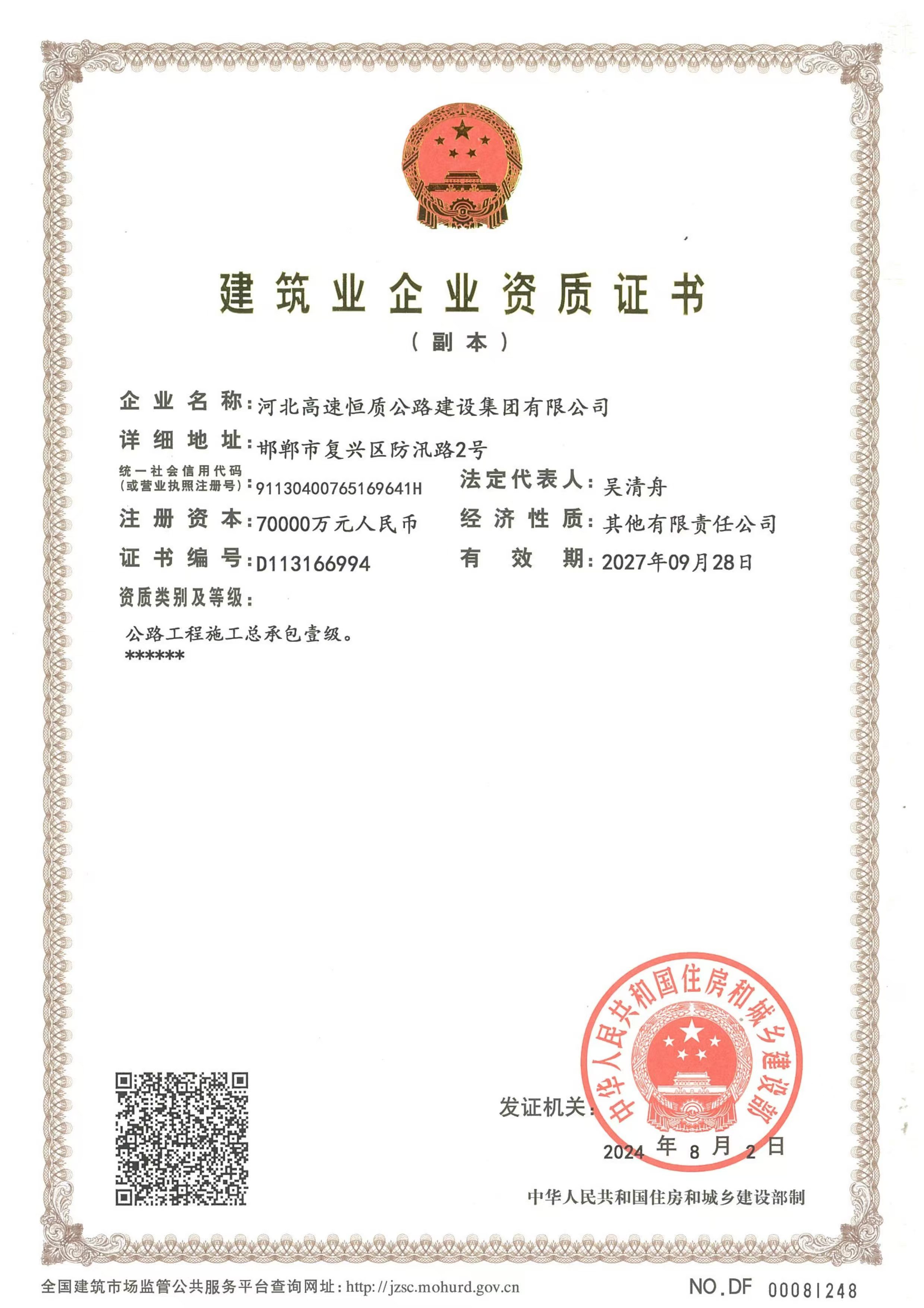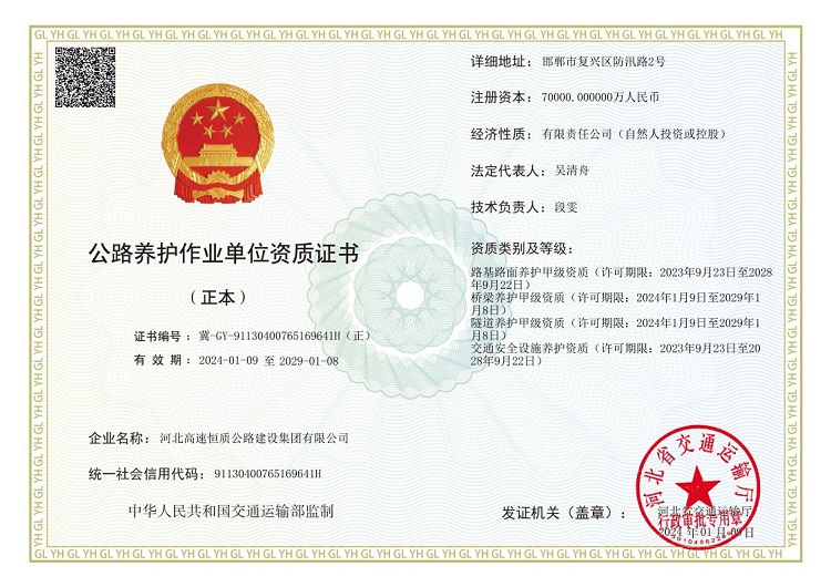 河北高速恒質公路建設集團有限公司始建于2004年,前身是邯鄲市恒質公路建設集團有限公司。2024年7月成為河北高速公路集團有限公司二級子公司,現有職工500余人,下轄18家子公司13個分公司,參股公司3家 ,注冊資本7億元,是一家集公路工程施工、路用材料研發(fā)生產、試驗檢測、瀝青貿易、公鐵物流于一體的多元化、綜合性單位,國家級高新技術企業(yè),河北省專精特新中小企業(yè),河北省首家瀝青拌合環(huán)保引領性企業(yè)。公司擁有公路工程總承包壹級、公路交通工程(公路安全設施)專業(yè)承包壹級、機電工程施工總承包貳級、電力工程施工總承包貳級、市政公用工程施工總承包貳級、建筑工...